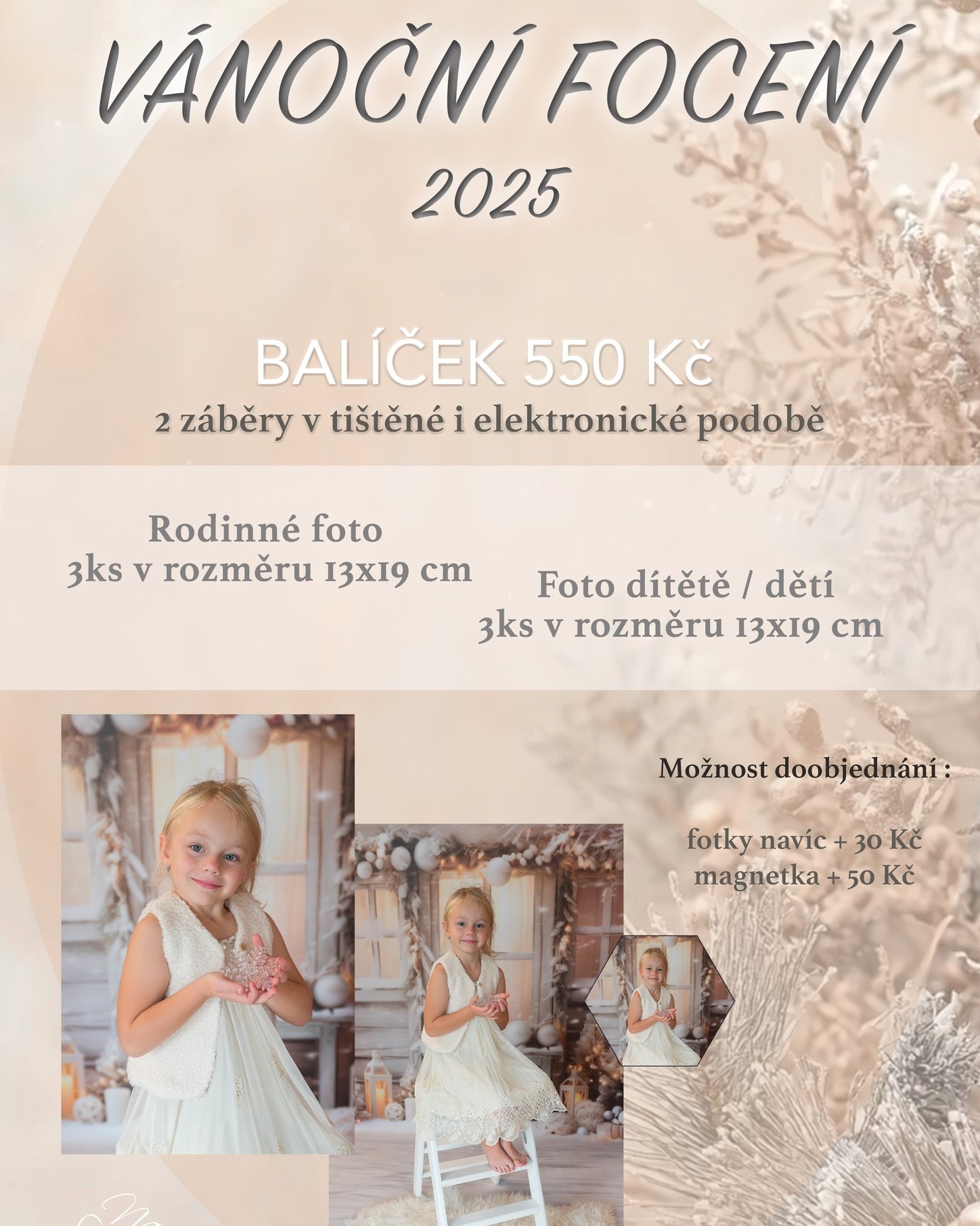 Ve spolupráci s fotografkou nabízíme balíček 3+3 fotografií za cenu 550 Kč. V ceně jsou 2 záběry v tištěné i elektronické podobě: