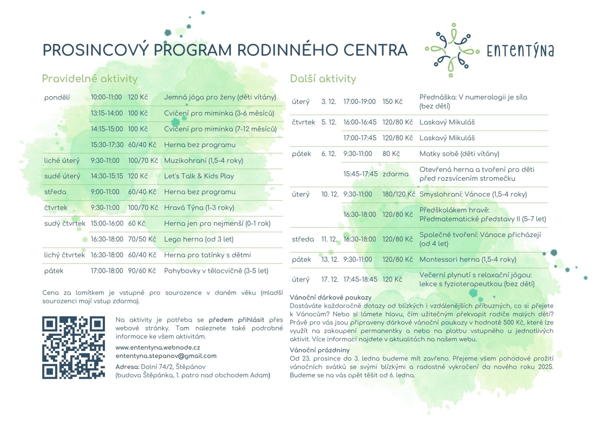 Přehled všech aktivit pro děti i dospělé v měsíci prosinci. Pravidelné i další aktivity hezky pohromadě. Teď už si jen vybrat, na co se přihlásíte....