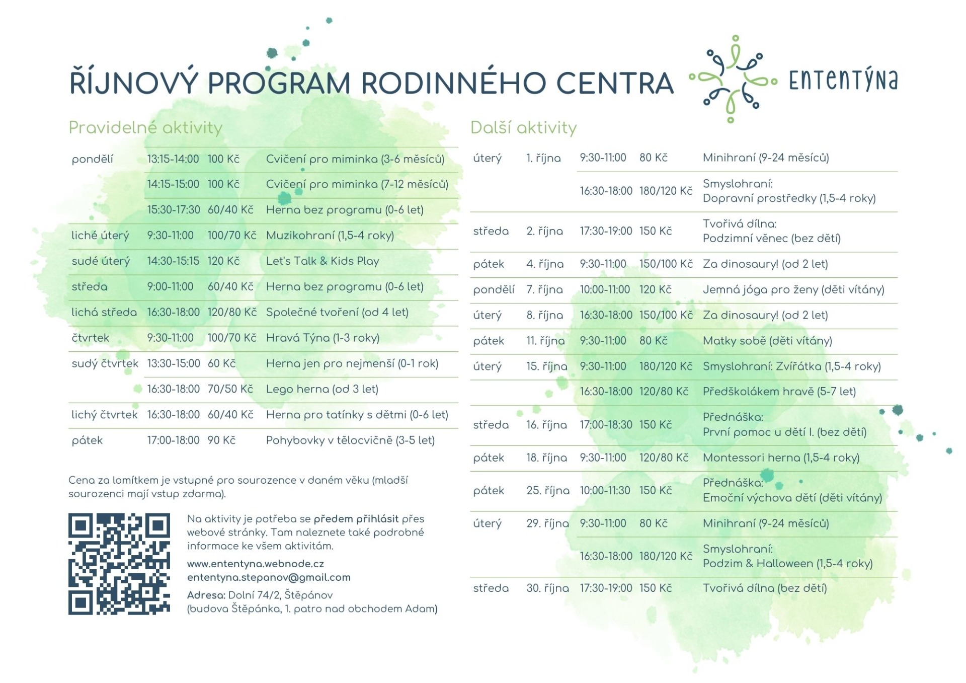 Přehled všech aktivit pro děti i dospělé v měsíci říjnu. Pravidelné i další aktivity hezky pohromadě. Teď už si jen vybrat, na co se přihlásíte....